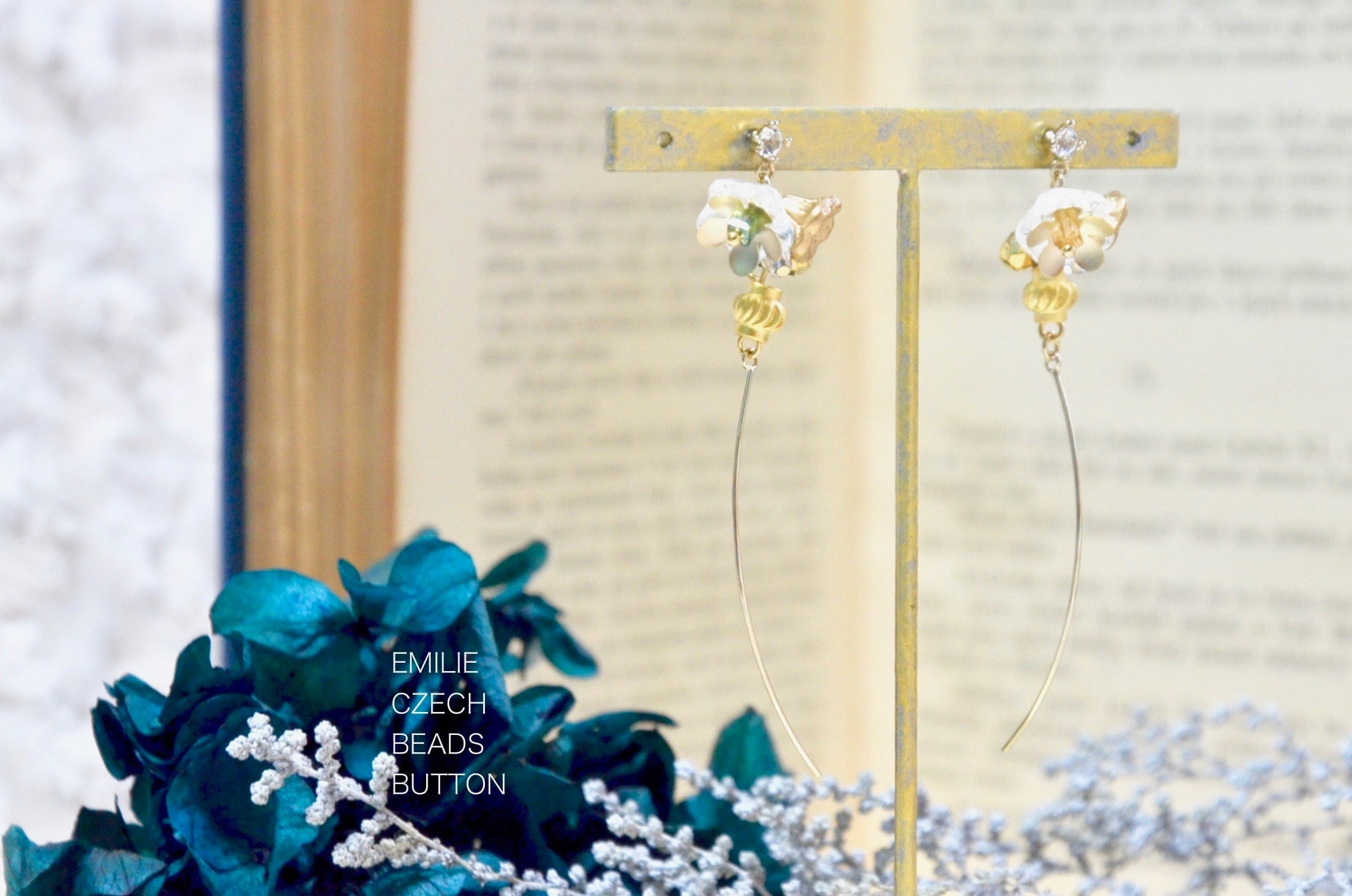 お花型の2種類のチェコガラスボタンをメイン素材として使用しています。ゴールド×透明を基調とした色彩展開です。やわらかく開いたカップ型のチェコガラスビーズです。花弁にはキューブ型の左右色違いのチェコビーズを使用しており、左右が微妙にアシメトリーになっています。