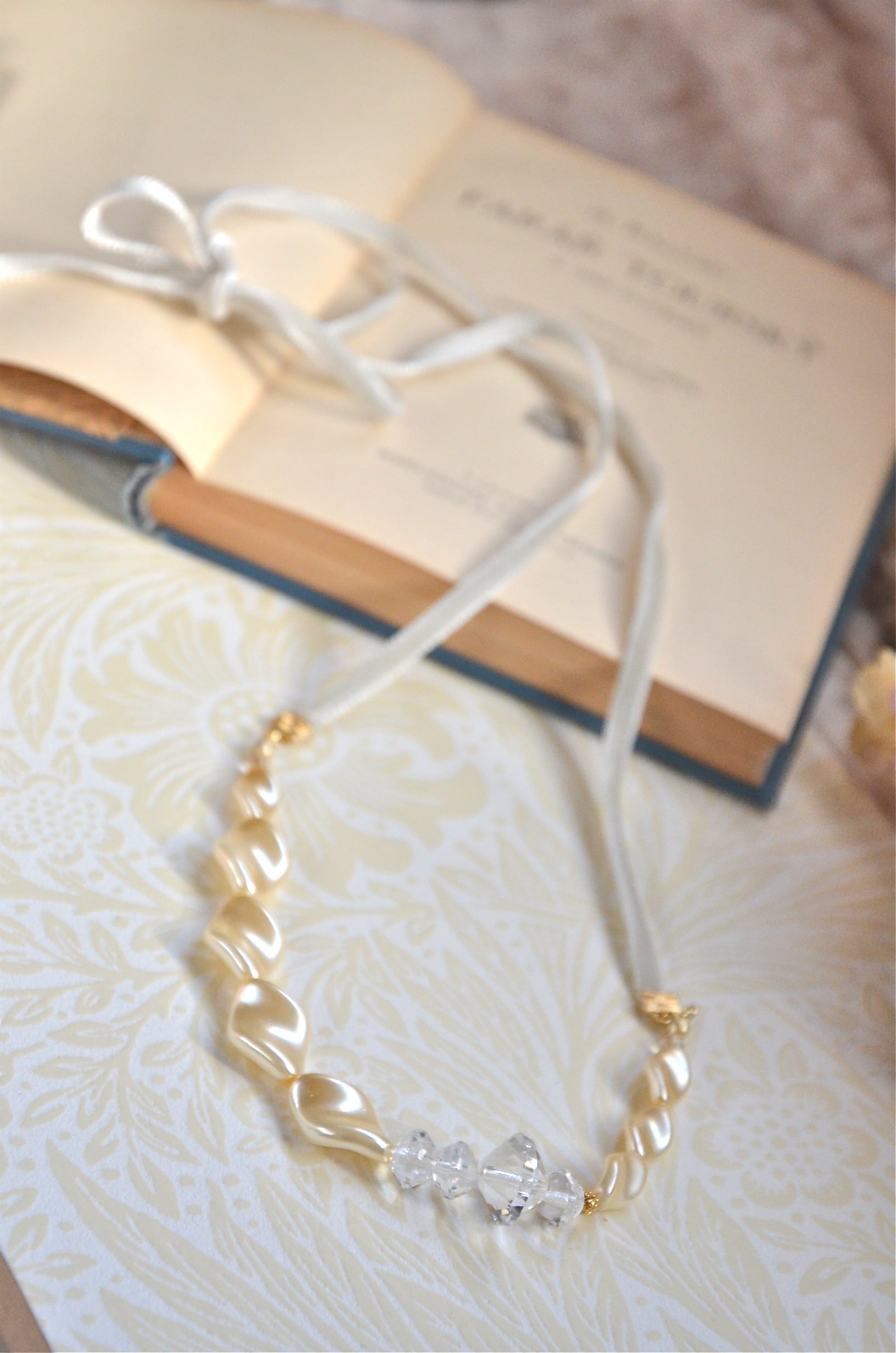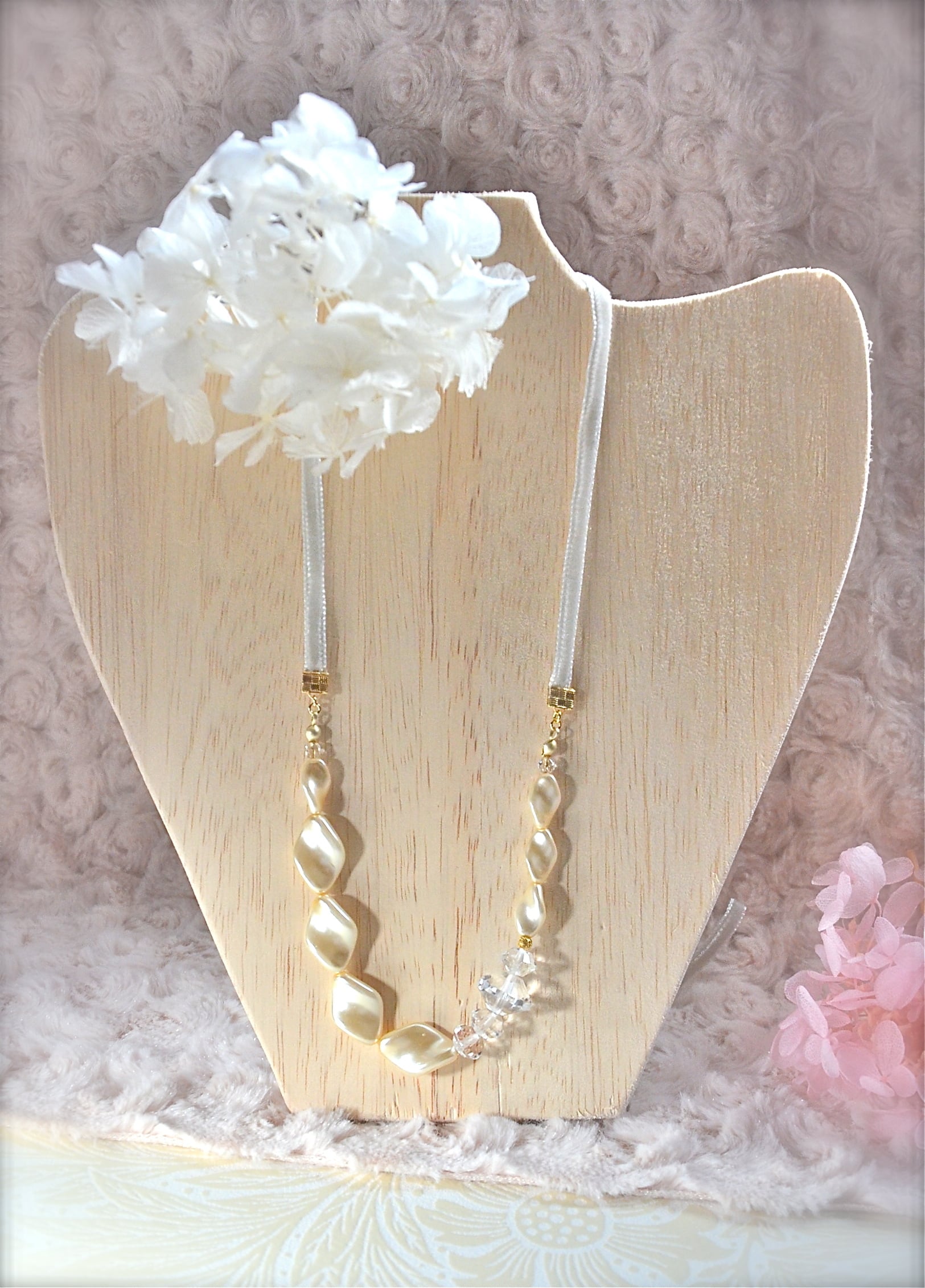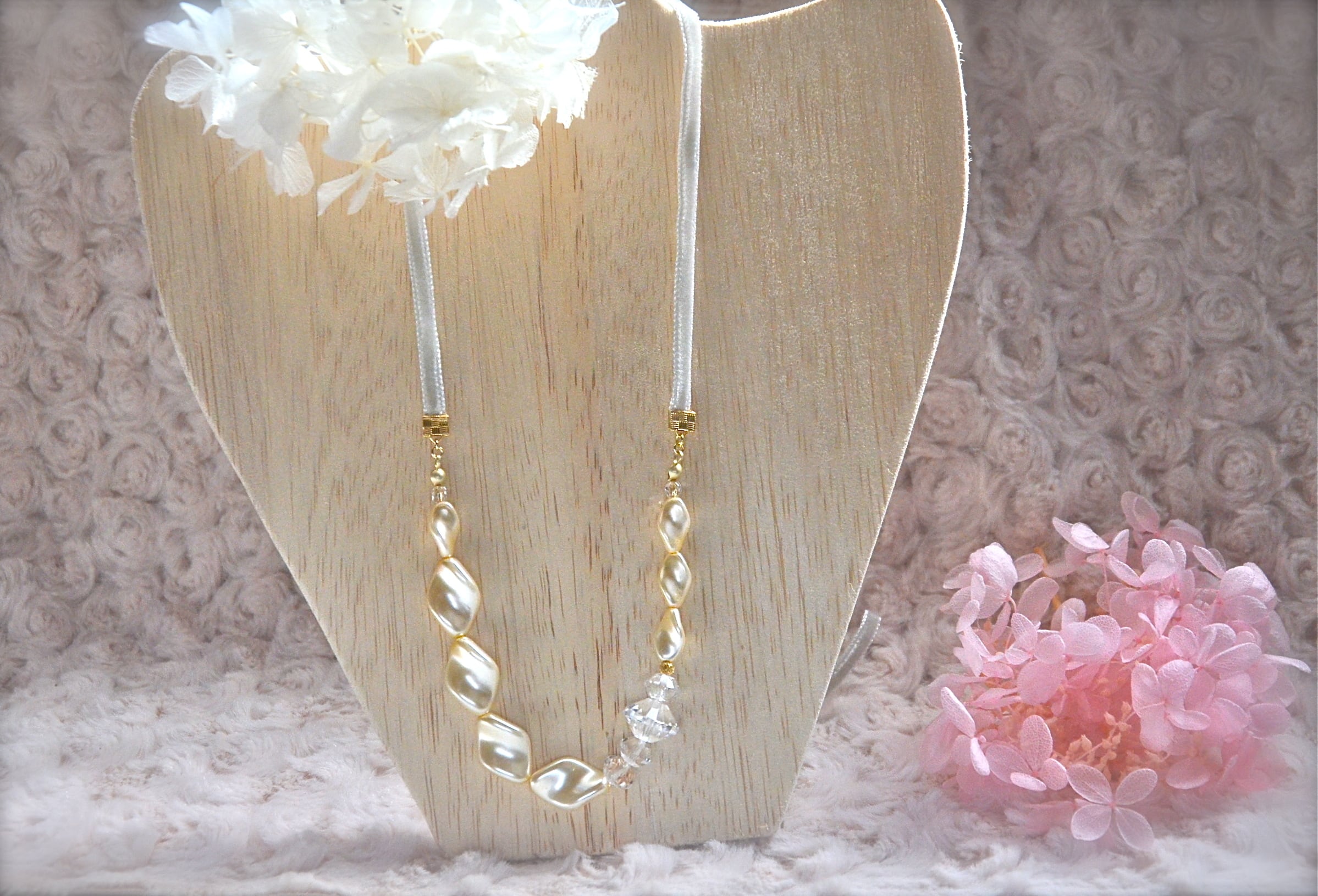リボンの長さは左右各42センチです。ネックレスを装いや好みによって、調節できます。