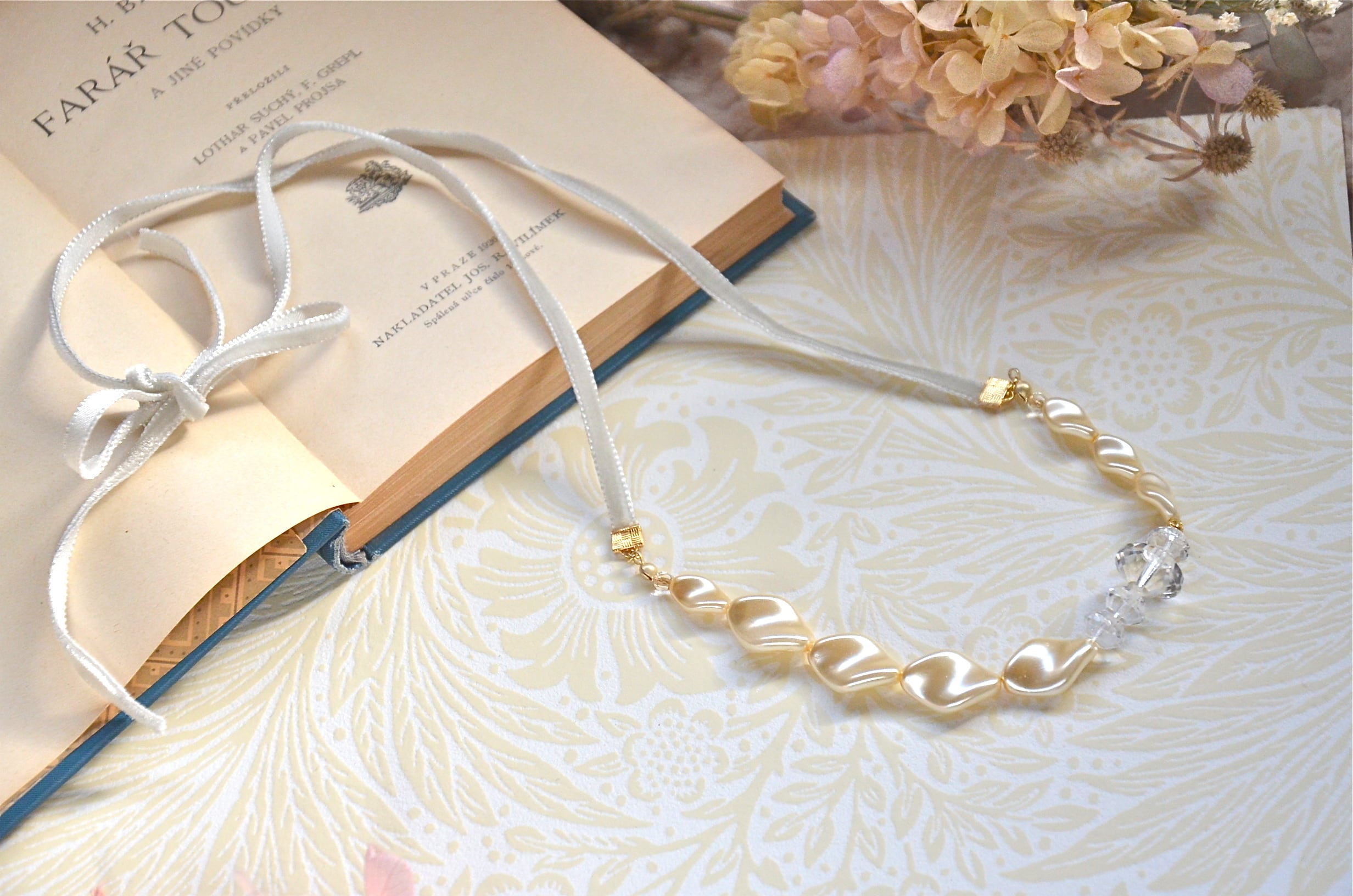 やわらかいベルベットリボンと、全体を引き締めるワンポイントの金属パーツの配置場所にもこだわりました。この金属ビーズのワンポイントが非常に効果的です。