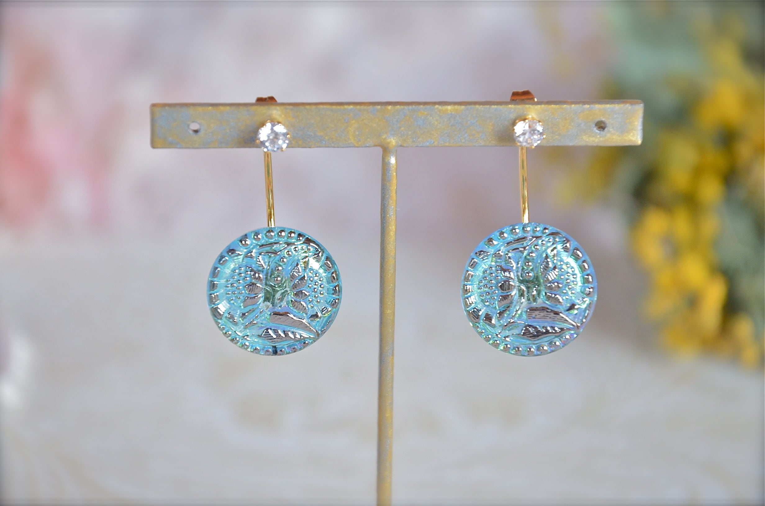 チェコガラスボタン、向日葵シリーズ【銀の向日葵】がピアスになりました。