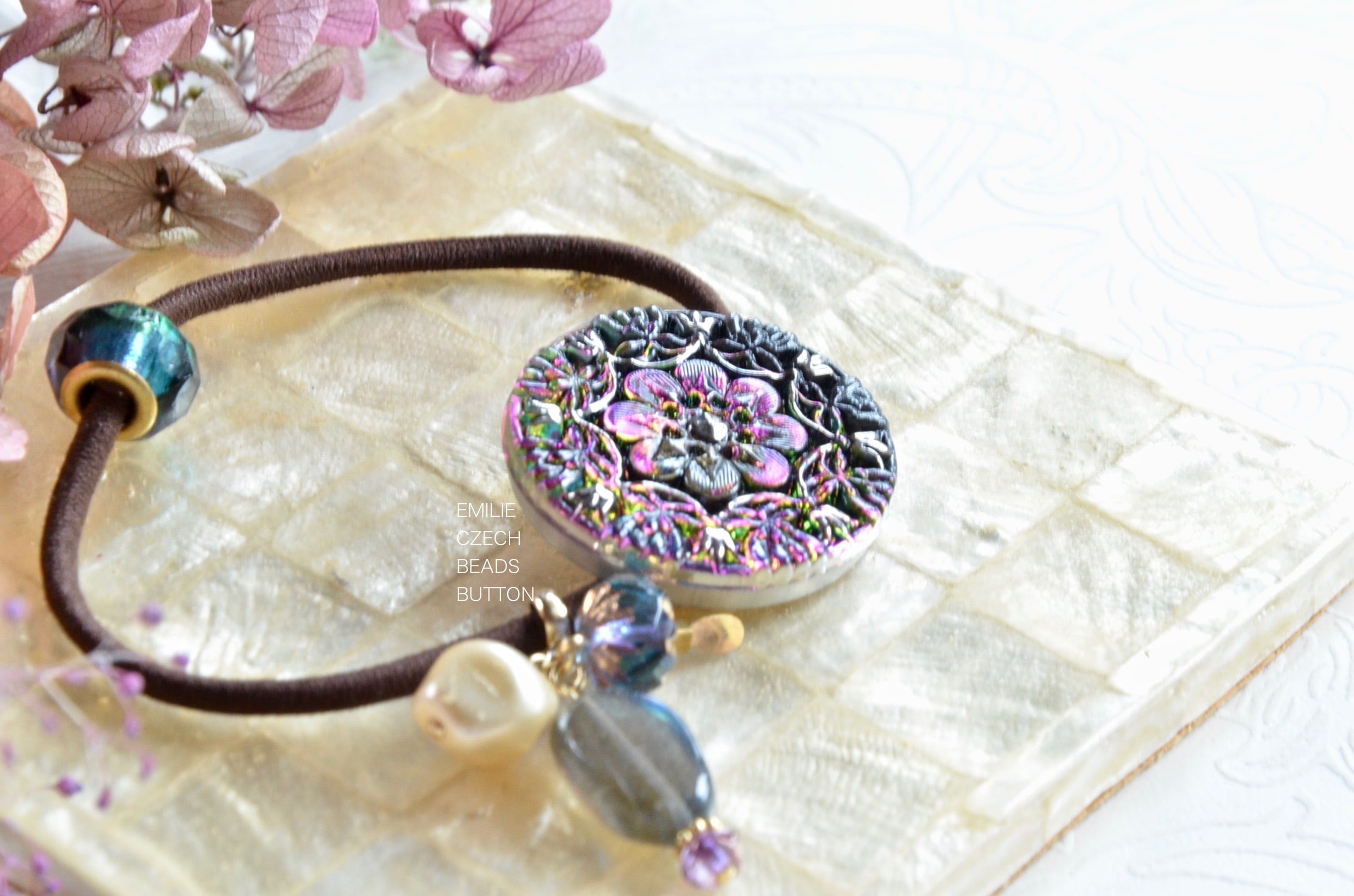 32㎜ボタンがとても特徴的で大変目立ちます。副素材はそのボタンに併せて敢えて抑え目にしております。今回初登場の18㎜天然石ラブラドライトを一粒。このラブラドライトも角度によって見え方が変わります。チェコガラスパールも柔らかく輝きます。