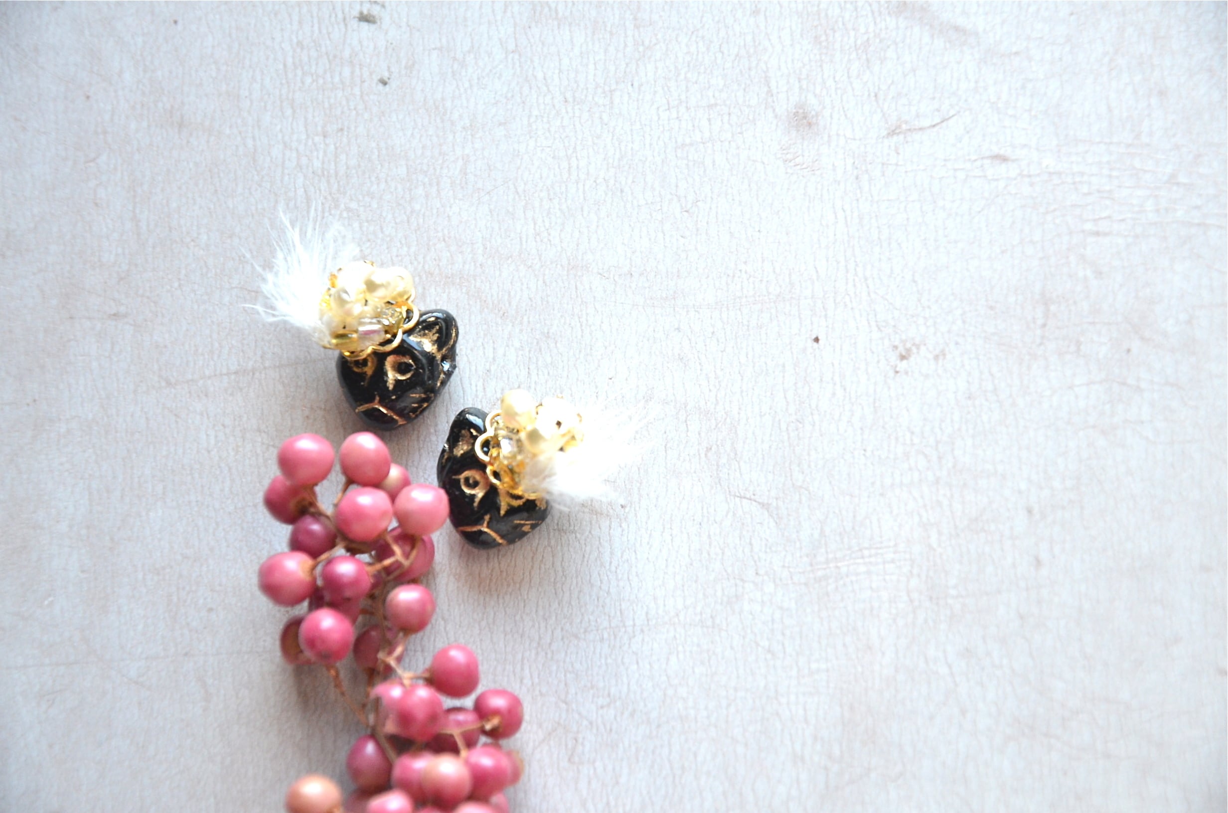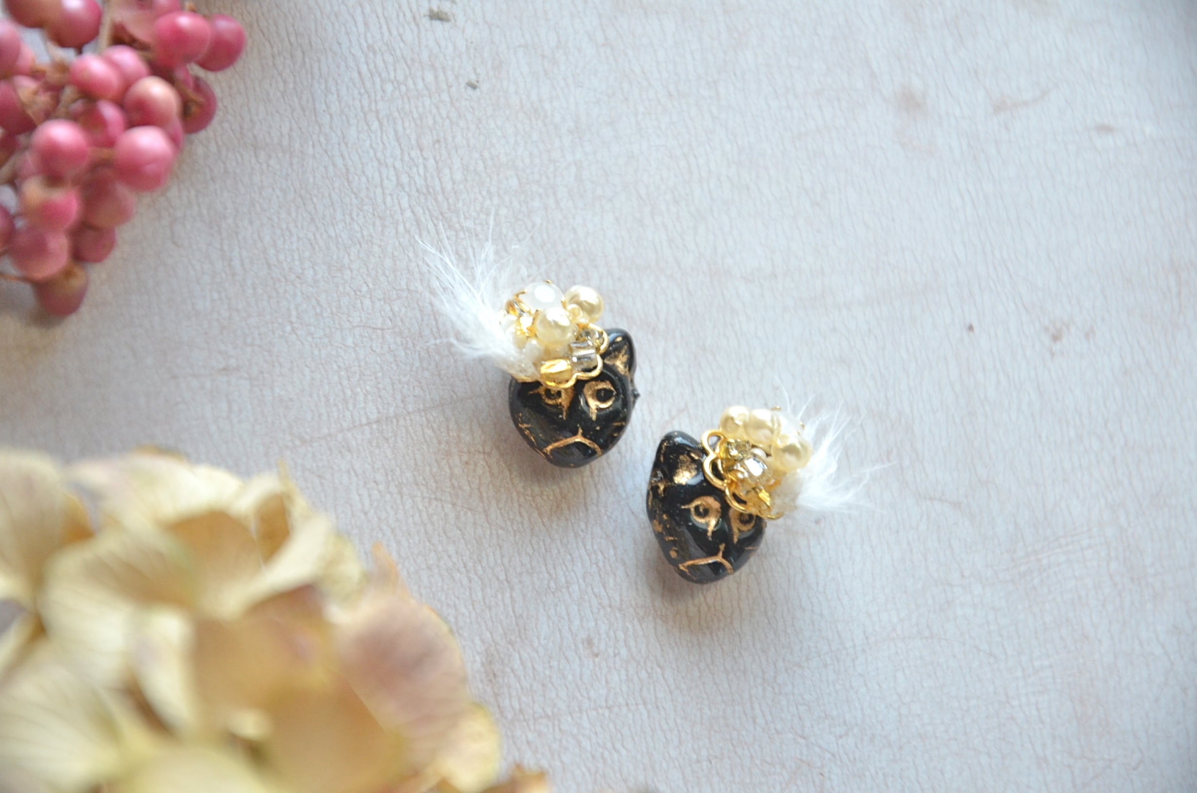猫の顔がプレスされたビーズをメイン素材にピアスを制作しました。